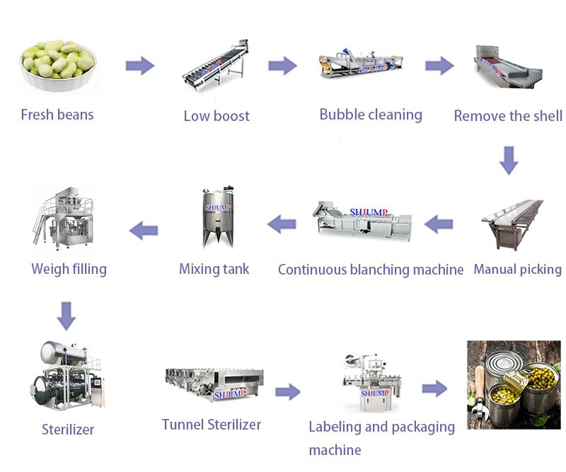 Especificação de processamento de feijão enlatado SHJUMP: 2. Visão geral do projeto de processamento de feijão enlatado SHJUMP: Os feijões possuem proteínas, fibras, ácido fólico e muitos minerais, como ferro, magnésio, potássio e zinco. Nossa SHJUMP oferece uma linha completa de máquinas de processamento de feijão enlatado. No enlatamento, o feijão é escaldado;...